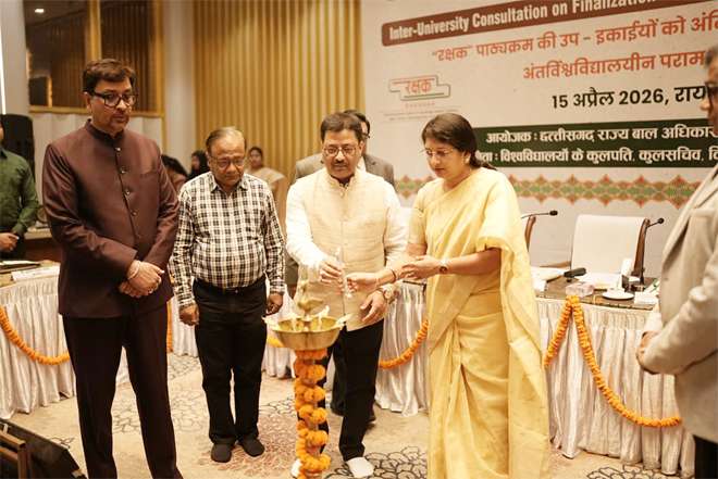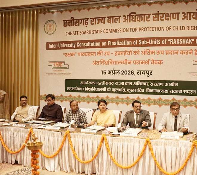 रायपुर : छत्तीसगढ़ राज्य बाल अधिकार संरक्षण आयोग, रायपुर द्वारा “रक्षक (RAKSHAK) पाठ्यक्रम” को राज्य में प्रभावी रूप से लागू करने की दिशा में सतत प्रयास किए जा रहे हैं। “रक्षक” पाठ्यक्रम एक विशेष शैक्षणिक पहल है, जिसका उद्देश्य महाविद्यालयीन विद्यार्थियों के माध्यम से बाल अधिकारों के प्रति जागरूकता बढ़ाना, बच्चों की सुरक्षा सुनिश्चित करना तथा समाज में बाल संरक्षण के प्रति संवेदनशीलता विकसित करना है। इस पाठ्यक्रम के क्रियान्वयन हेतु पूर्व में मुख्यमंत्री श्री विष्णुदेव साय जी की उपस्थिति में महिला एवं बाल विकास मंत्री श्रीमती लक्ष्मी रजवाड़े जी तथा उच्च शिक्षा मंत्री श्री टंक राम वर्मा जी के सहयोग से एमओयू संपन्न किया गया था। यह एमओयू राज्य के उच्च शिक्षण संस्थानों में “रक्षक” पाठ्यक्रम को लागू करने की दिशा में एक महत्वपूर्ण कदम रहा है, जिससे विद्यार्थियों को बाल अधिकारों और सुरक्षा संबंधी विषयों में प्रशिक्षित किया जा सके। इसी क्रम में आज दिनांक 15 अप्रैल 2026 को रायपुर स्थित होटल बेबिलोन में “रक्षक” पाठ्यक्रम के अंतर्गत तैयार उप-इकाइयों (सब-यूनिट्स) को अंतिम रूप प्रदान करने हेतु विश्वविद्यालयीन परामर्श बैठक का आयोजन किया गया।