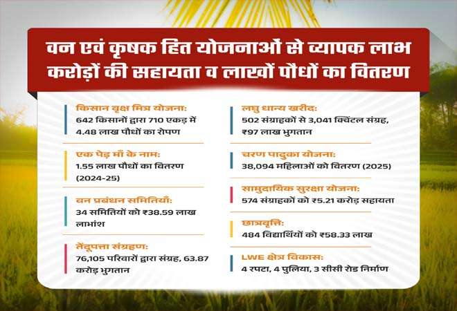 रायपुर : प्रदेश में हरियाली पर्यावरण एवं ग्रामीणों के जीवन के लिए कितना महत्वपूर्ण हैं, इसका अंदाजा ग्रामीणों के जीवन के आए बदलाव से लगाया जा सकता है। वन विभाग और ग्रामीण समुदाय के लिए विकास, पर्यावरण संरक्षण और सामाजिक सशक्तिकरण की दृष्टि से वर्ष 2024 एवं 2025 कई मायनों में काफी महत्वपूर्ण रहे है।