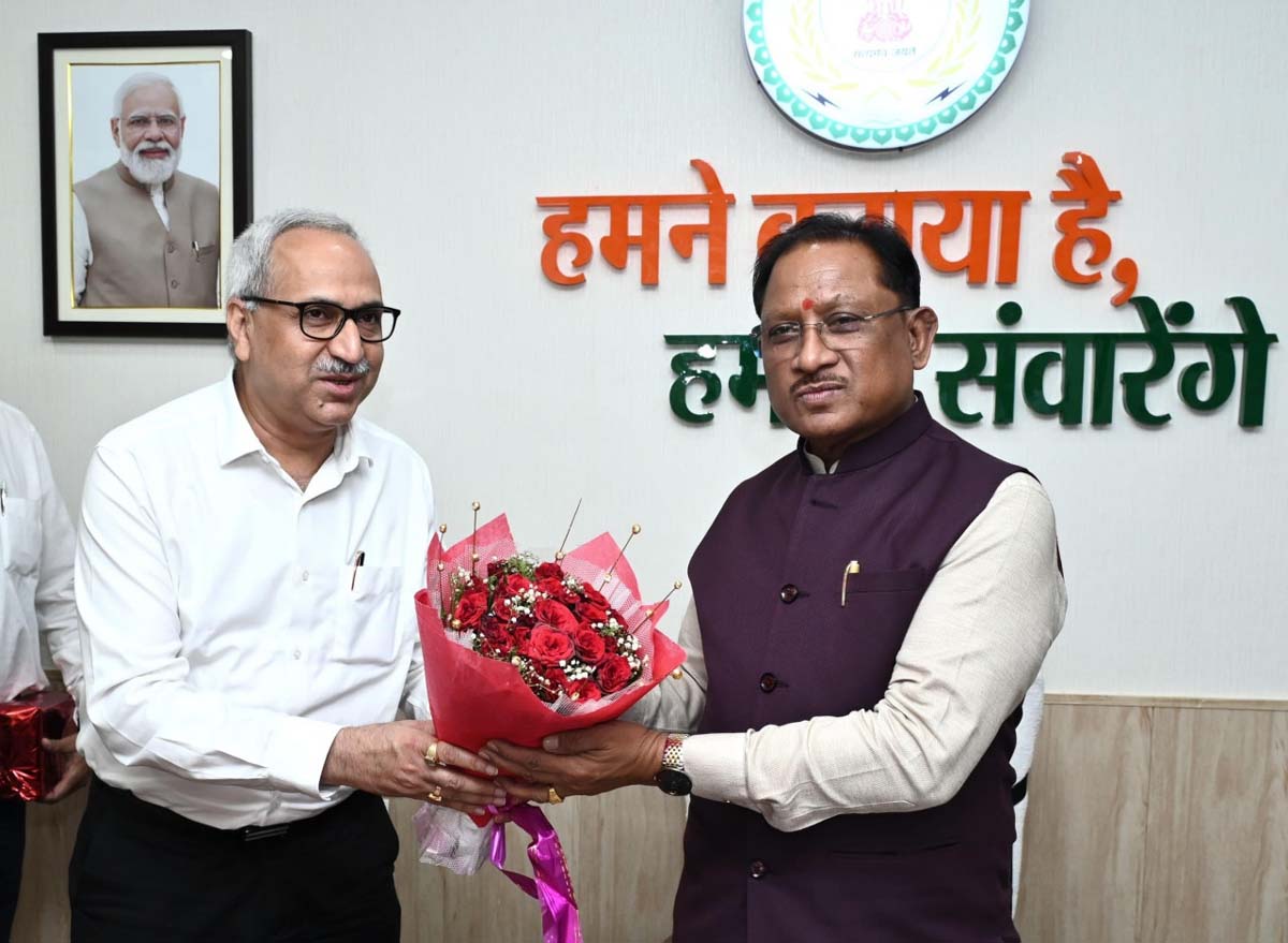 रायपुर : मुख्यमंत्री श्री विष्णु देव साय से आज राजधानी रायपुर स्थित मुख्यमंत्री निवास कार्यालय में भिलाई स्टील प्लांट के नवनियुक्त निदेशक श्री चित्त रंजन महापात्र ने सौजन्य मुलाकात की। इस अवसर पर श्री महापात्र ने मुख्यमंत्री श्री साय को पुष्पगुच्छ, शॉल और श्रीफल भेंट कर सम्मानित किया। मुख्यमंत्री ने श्री महापात्र को उनकी नवीन पदस्थापना पर हार्दिक बधाई एवं शुभकामनाएँ दीं।