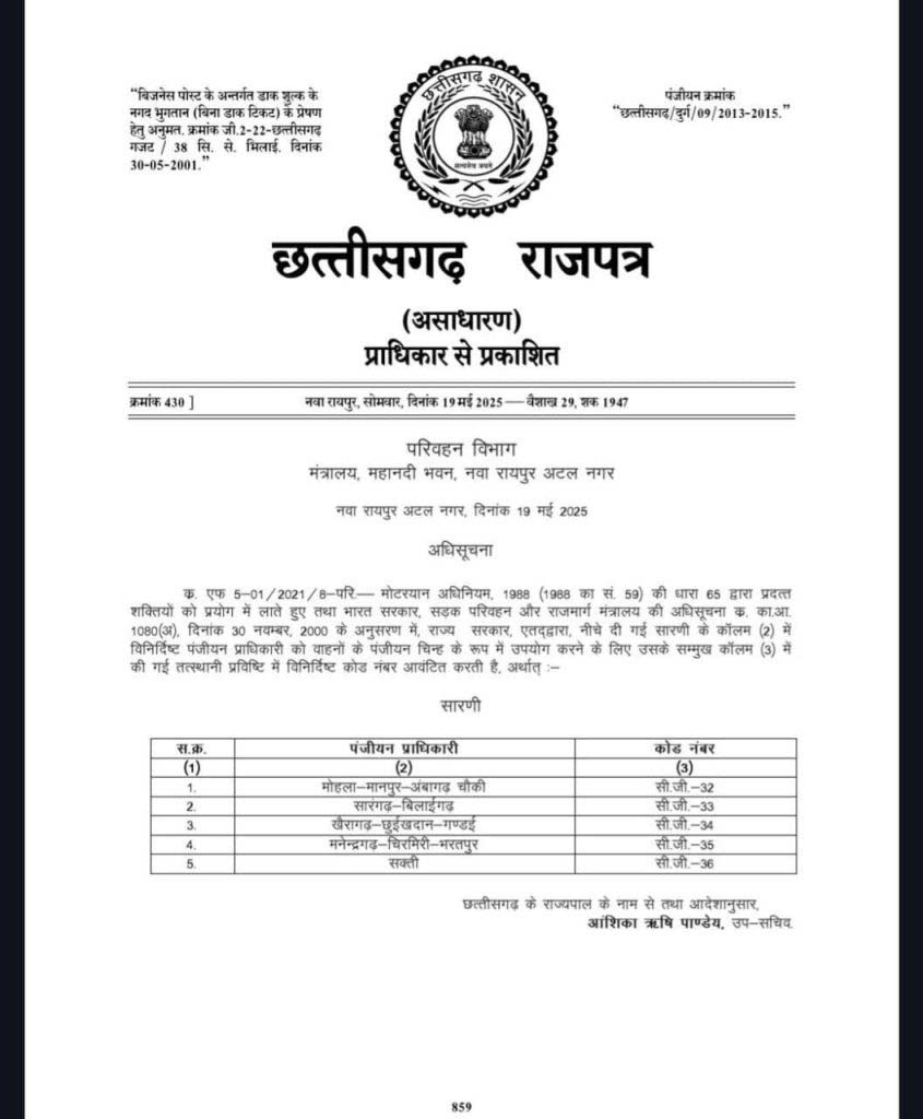 रायपुर. साय सरकार ने प्रदेश के 5 नए जिलों को वाहनों के पंजीयन कोड आबंटित किए हैं. इसकी अधिसूचना परिवहन विभाग छग शासन ने राजपत्र में प्रकाशित कर दी गई है.